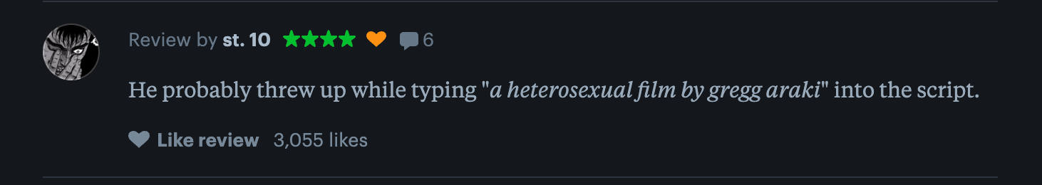 The film in and of itself emulates the feelings of queer repression. The bold title-card, A HETEROSEXUAL FILM BY GREGG ARAKI, sets a parameter for the film’s world-building. Yet, we are still fed long shots of our two male main characters looking at each-other longingly, eventually culminating in the dissemination of the tension, usually caused by some external plot element. It puts the readers in a state of confusion and longing beside the characters. To be queer in a heterosexual film (to be queer in a heterosexual world).
